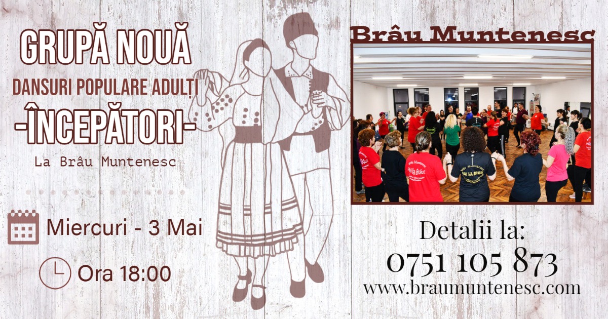 Cu mare plăcere vă anunțăm că pe data de 3 mai vom începe o nouă grupă de dansuri populare pentru adulți începători la Brâu Muntenesc!